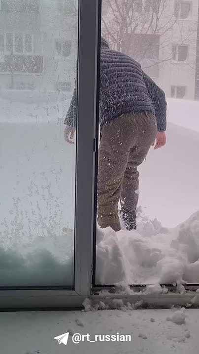 На Камчатке сугробы такой высоты, что из дома людям приходится выходить прямо через окно первого этажа.
