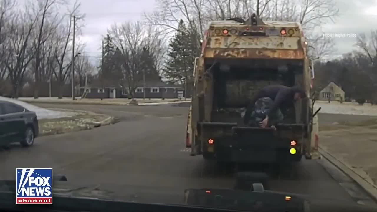 На записи видно, как сотрудник коммунальных служб открывает бак, замечает мужчину внутри и пытается прилечь внимание полицейских, активно прыгая и отбегая от мусоровоза.