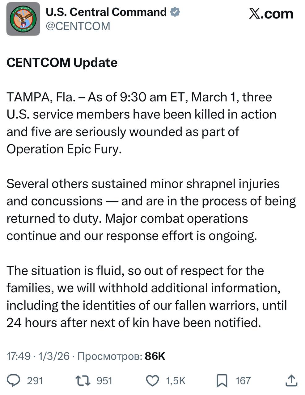 Центральное командование ВС США объявляет, что 3 американских солдата были убиты в результате удара иранских баллистических ракета, еще пятеро получили ранения.