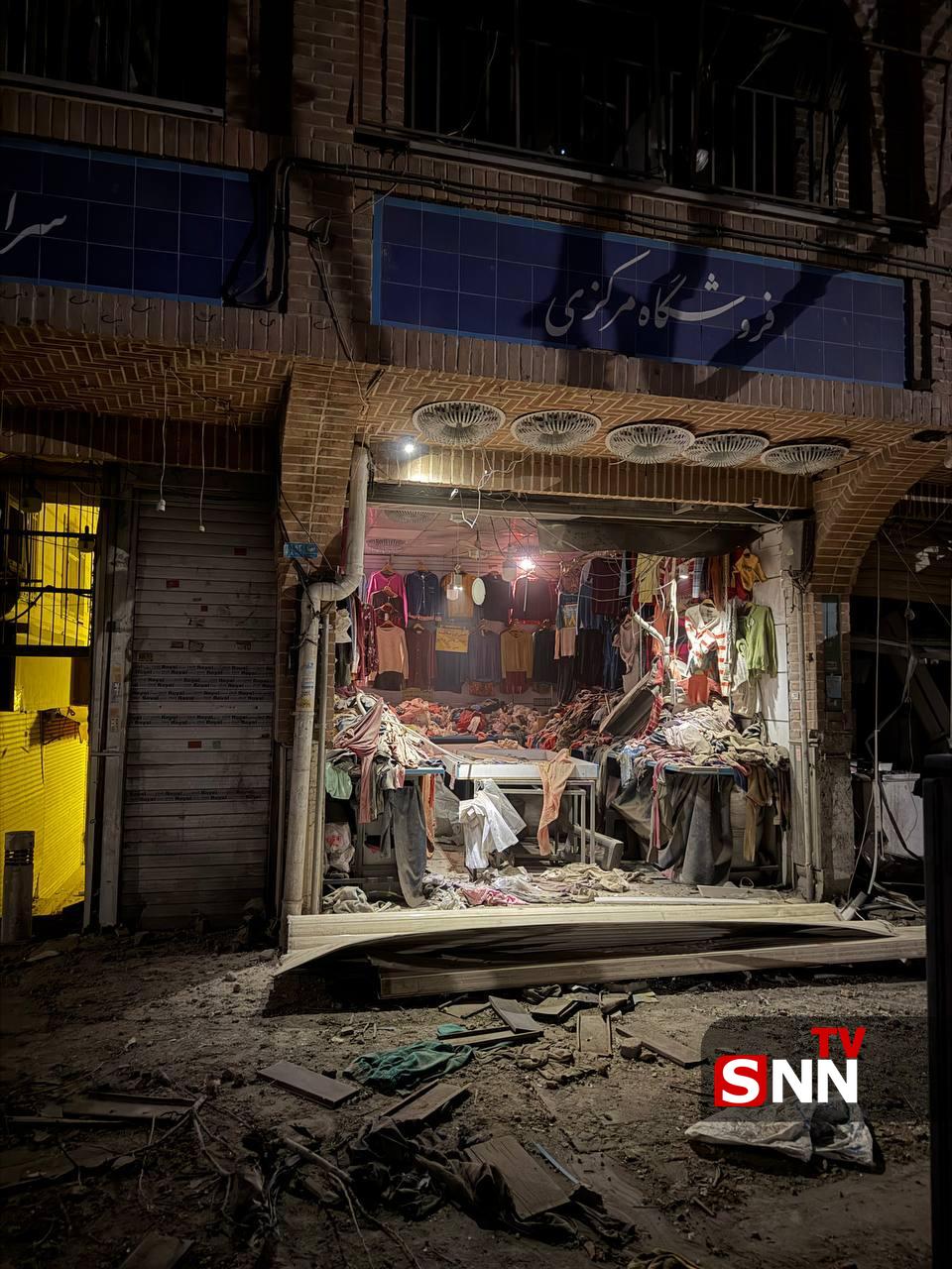 На фото — разрушенные торговые лавки и испорченные товары. Видны повреждения на зданиях.