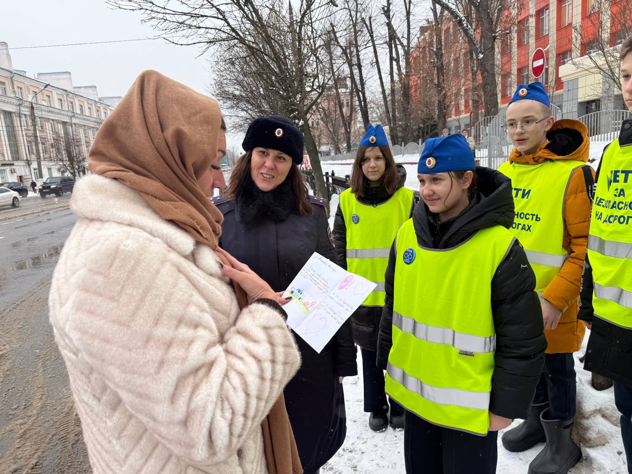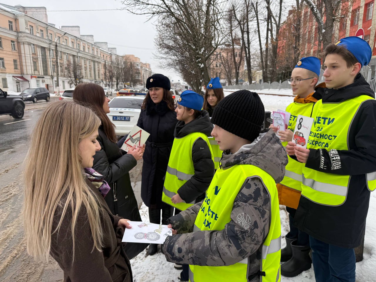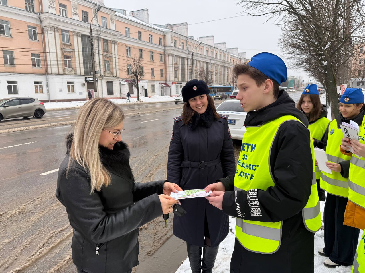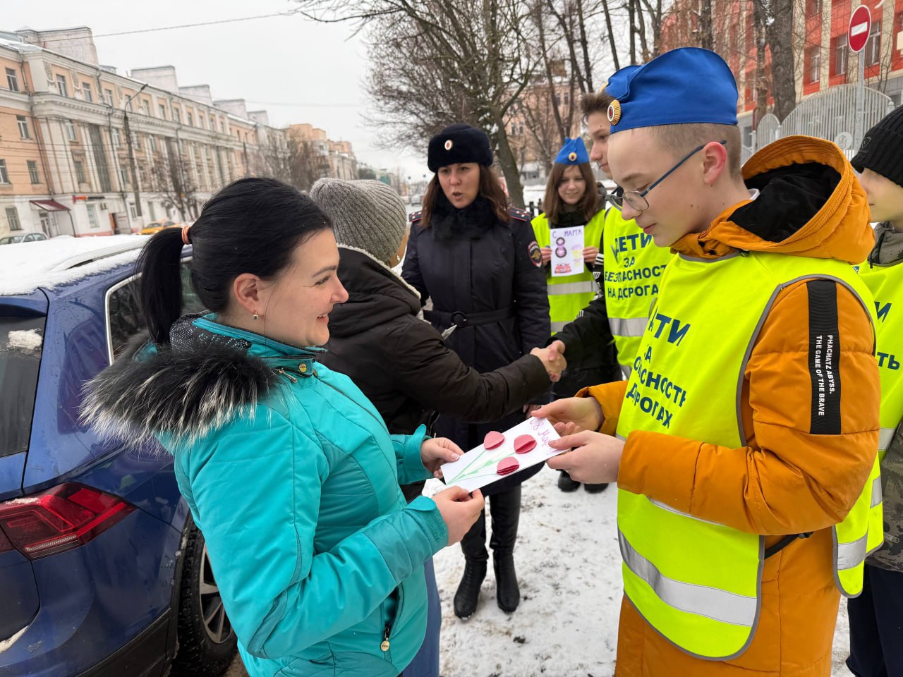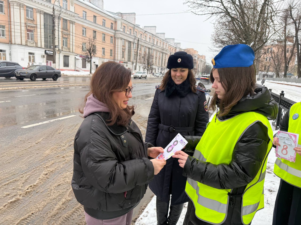 04 марта 2026 года в преддверии Международного женского дня автоинспекторы вместе с ребятами из отряда Юных инспекторов движения Тверского лицея города Твери поздравили автоледи с предстоящим праздником. Всем участницам акции кадеты вручали открытки с весенними пожеланиями, сделанные собственными руками, желали добра, тепла и солнечного настроения, и конечно же безопасных дорог. Женщины получили массу положительных эмоций.