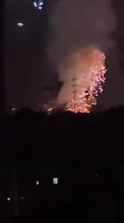 На видео — предварительно, момент удара. От взрыва вокруг нижней части здания поднимается облако дыма и рассыпаются искры.