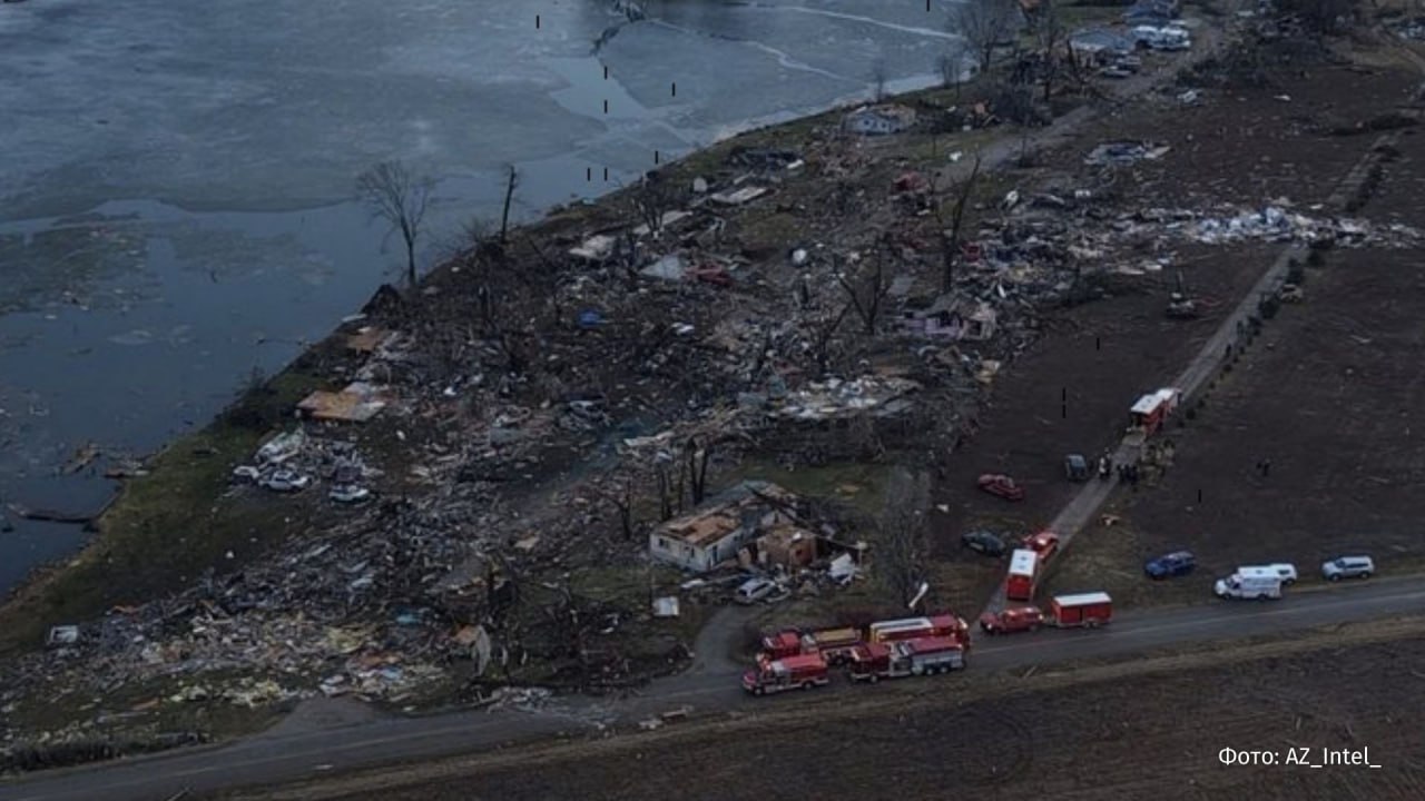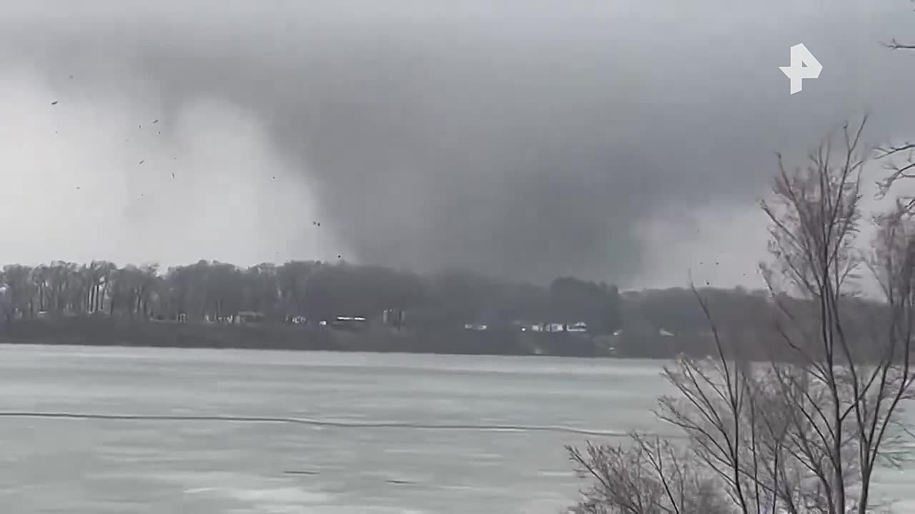 На кадрах — последствия шторма и сам торнадо. Ветряная воронка закручивается и поднимает в воздух обломки домов.