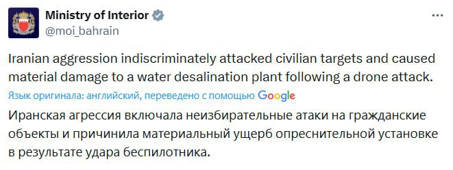 Иран ударил беспилотником по установке опреснения воды в Бахрейне, сообщили в МВД страны.