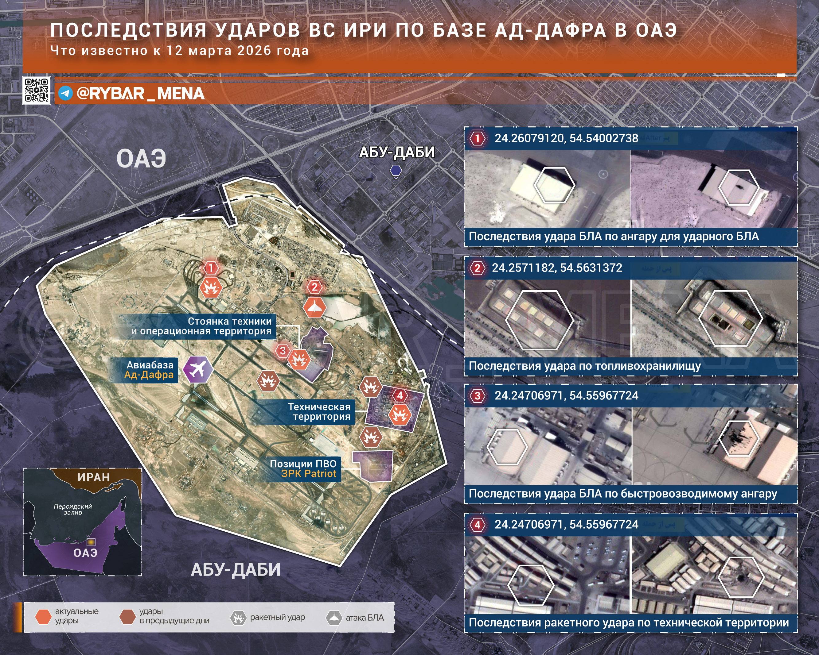 В административной части есть также несколько довольно чувствительных попаданий. Поражен крупный ангар, а на востоке, судя по воронке среди строений, прилетела все-таки баллистика, об ударе которых сообщалось еще в первый день.