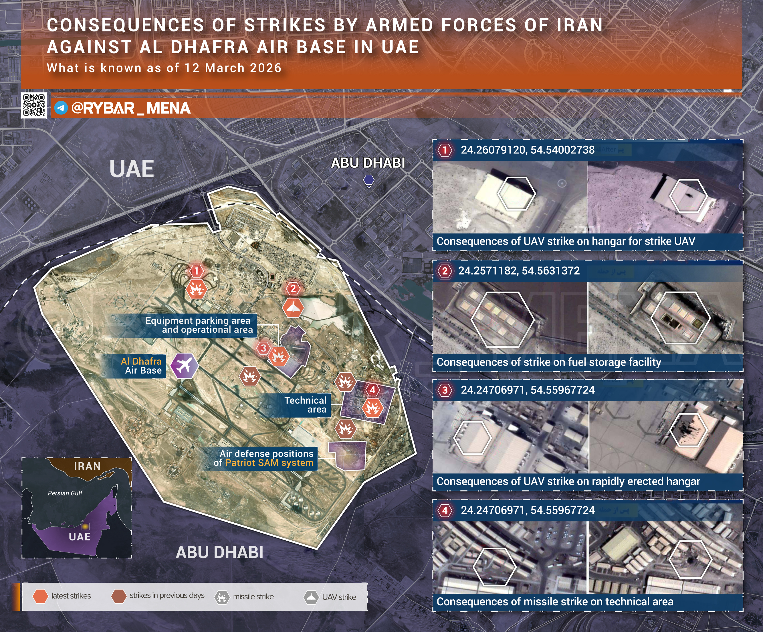 Одной из самых часто фигурирующих в заявлениях КСИР целей стала авиабаза Ад-Дафра рядом с Абу-Даби. И спутниковые снимки позволяют пролить свет на некоторые последствия атак ракет и дронов.