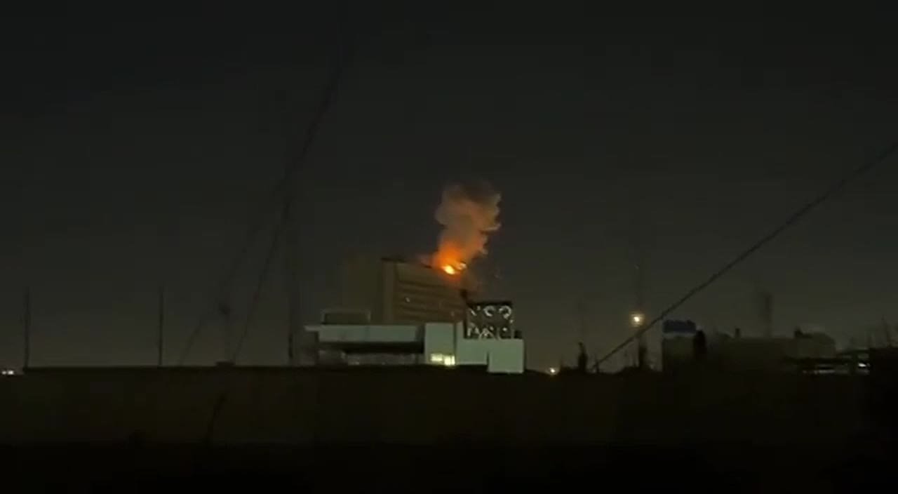 На видео — вспышка озаряет ночное небо возле здания, начинается пожар.