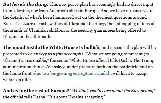 ‘В разработке этого нового мирного плана, похоже, не участвовала напрямую ни Украина, ни союзники Америки в Европе. Настроение в Белом доме уверенное, и, судя по всему, план собираются предъявить Зеленскому как свершившийся факт.