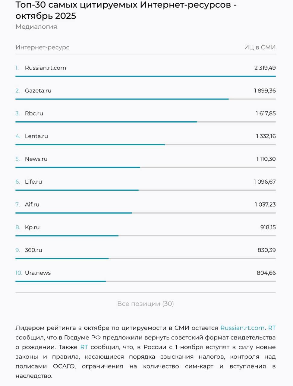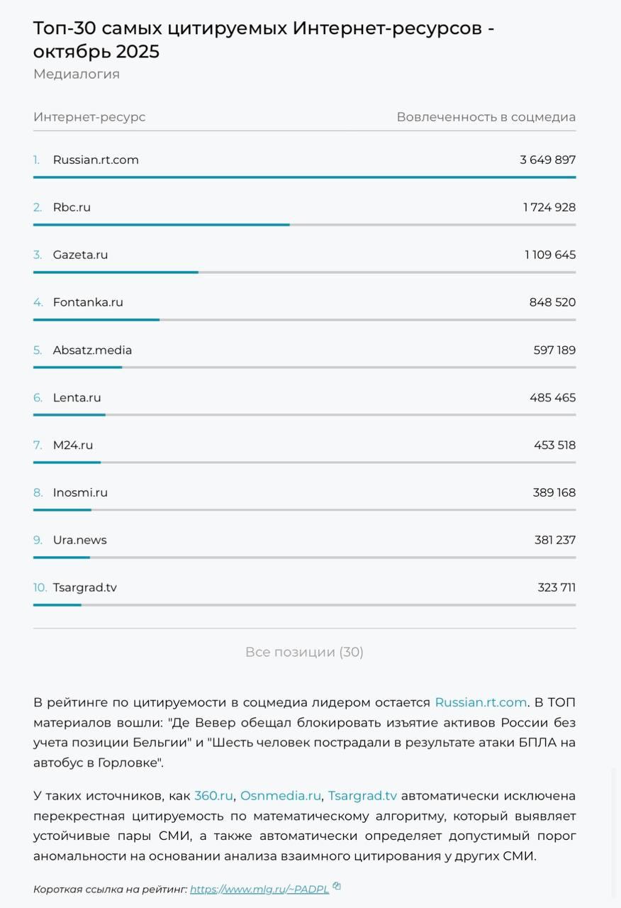 Сайт «RT на русском» третий раз подряд — на первом месте в топ-30 самых цитируемых интернет-ресурсов в СМИ.