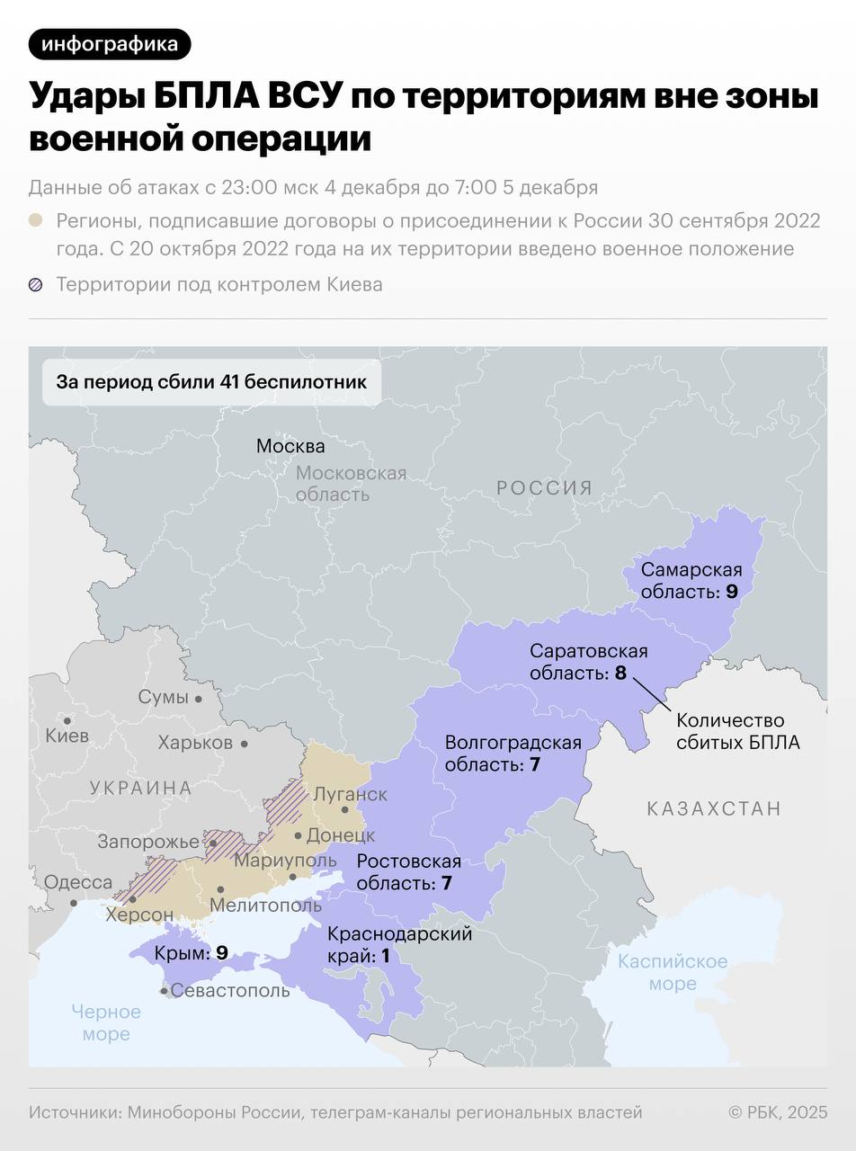 Атаки украинских дронов на российские регионы в ночь на 5 декабря — в инфографике.
