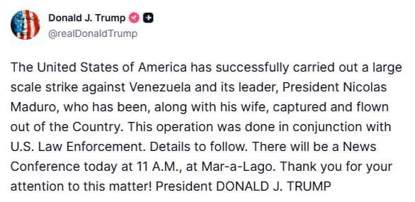 США успешно провели полномасштабный удар по Венесуэле, Николас Мадуро вместе с женой был захвачен и вывезен из страны, сообщил президент США Дональд Трамп.