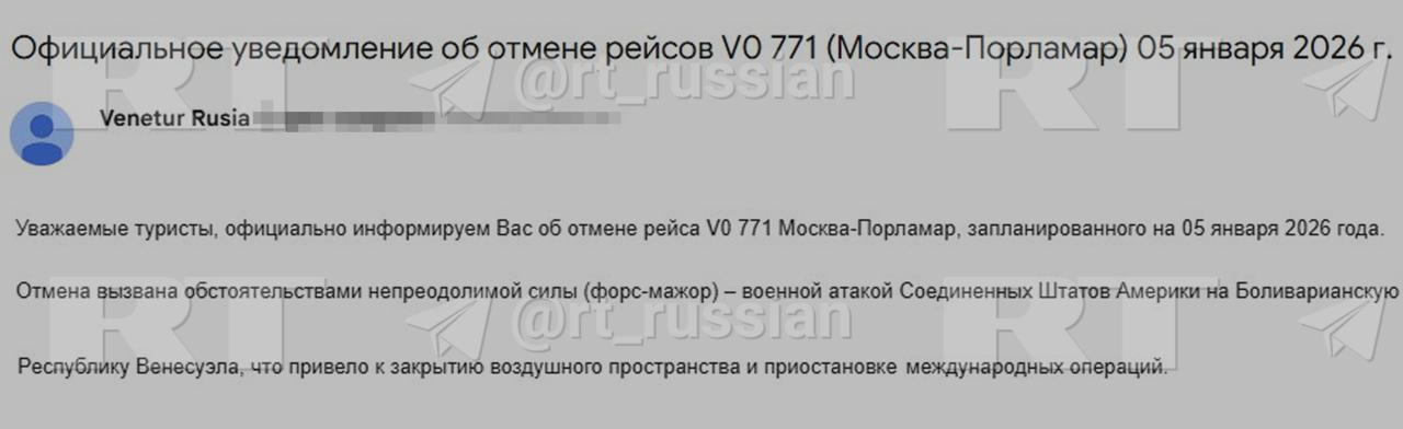 «Отмена вызвана обстоятельствами непреодолимой силы (форс-мажор) — военной атакой США на Боливарианскую Республику Венесуэла, что привело к закрытию воздушного пространства и приостановке международных операций», — говорится в письме.