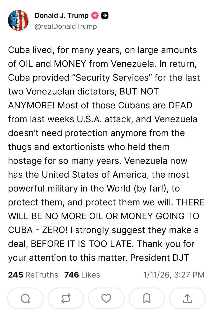 Теперь у Венесуэлы есть Соединённые Штаты Америки — самая мощная армия в мире (и с большим отрывом!), — которая будет её защищать. И мы будем её защищать. Больше никакой нефти и никаких денег Кубе — ноль! Я настоятельно советую им пойти на сделку, пока не стало слишком поздно.