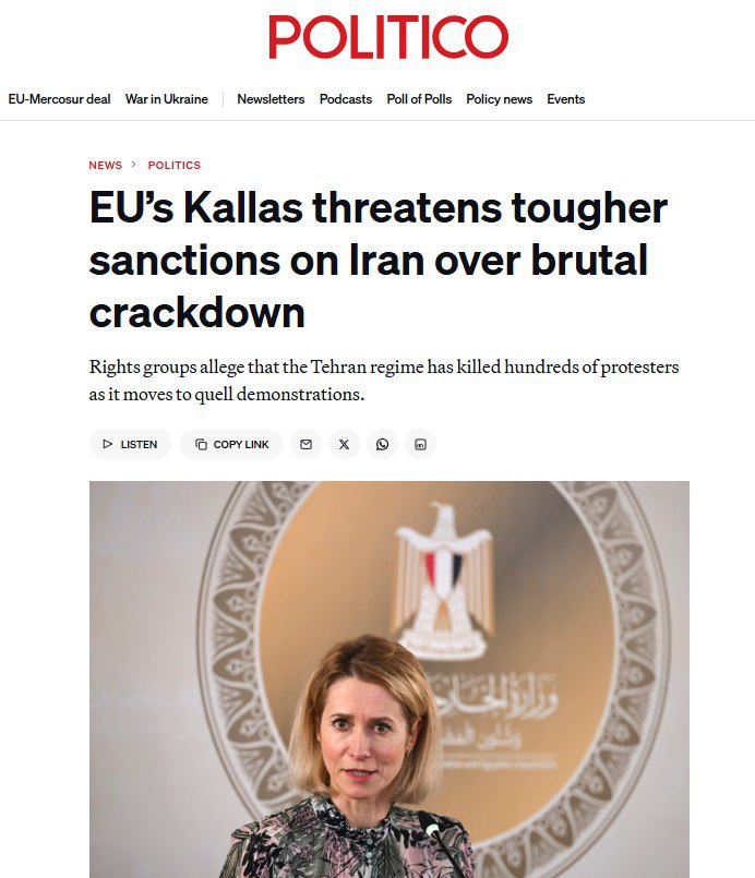 ‘Кая Каллас готовится ввести новые санкции против Ирана за то, что правительство подавляет протесты‘ – Politico о желании ЕС любой ценой защитить госпереворот.