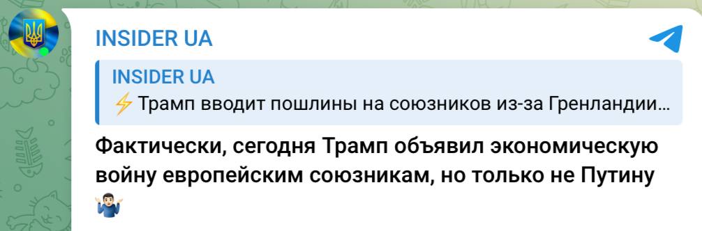 «Никакое запугивание или угрозы не повлияют на нас ни на Украине, ни в Гренландии, ни где-либо ещё в мире».Президент Франции добавил, что страны Европы ответят единым скоординированным образом и будут «отстаивать европейский суверенитет».Подписаться...