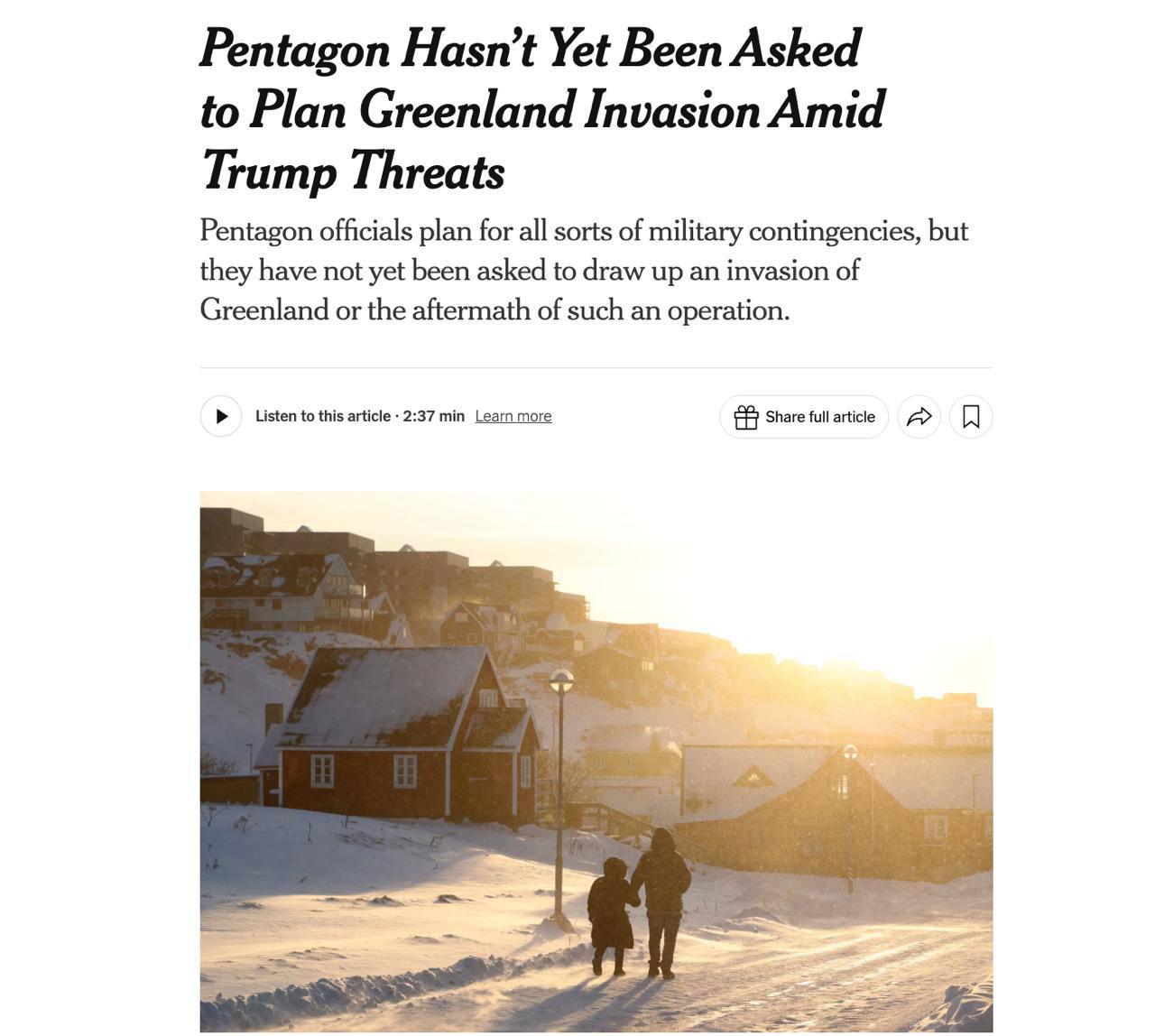 Пентагону пока не поручали разработать план военной операции в Гренландии, пишет NYT.