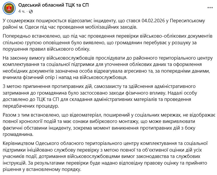 Предварительно, человек оказал сопротивление и совершил нападение на военнослужащего. С целью самозащиты сотрудники ТЦК применили к гражданину меры физического воздействия. Установлено, что видеоматериал, распространённый в социальных сетях, не отражает полной хронологии событий и имеет признаки выборочного монтажа, что может искажать фактические обстоятельства инцидента