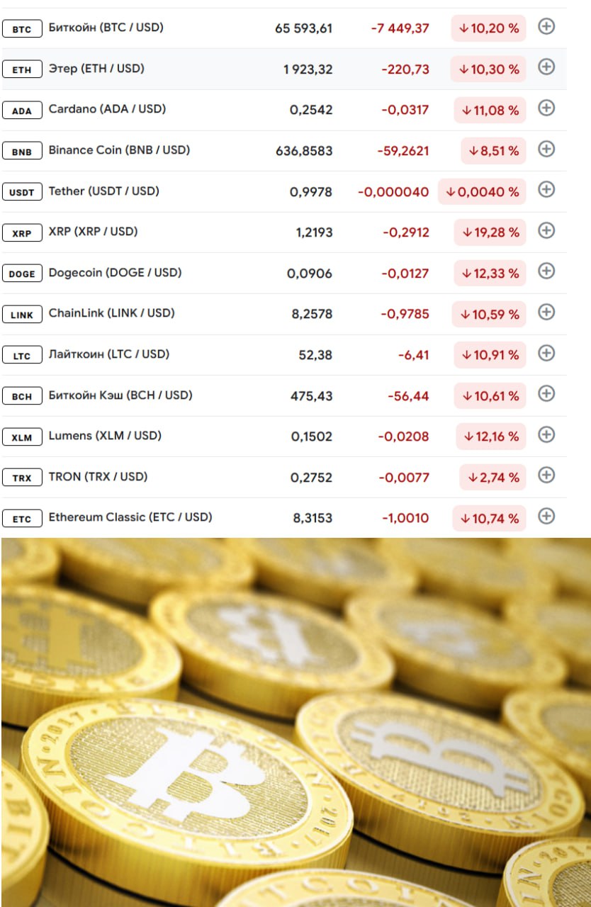Курс биткоина уже $65,5 тыс. За неделю он потерял 22% стоимости.