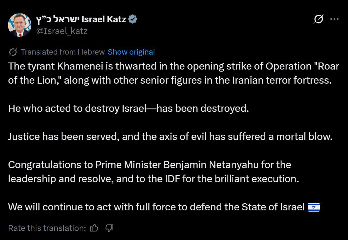 Президент Масуд Пезешкиан пообещал стереть «американо-сионистских агрессоров». Спикер парламента Ирана Мохаммад Багер Галибаф пообещал разрушительные удары и в очередной раз подчеркнул, что «переступившие красную черту заплатят высокую цену». Планы на случай гибели Али Хаменеи были проработаны заранее. В Иране наблюдается колоссальная поддержка войны до победного конца: по улицам проходят многочисленные митинги и демонстрации. Консолидация иранского общества только усилилась.