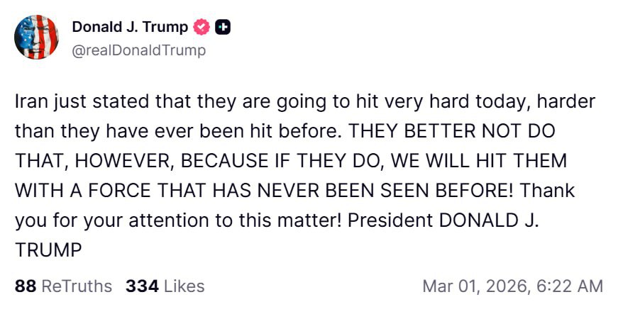 В ответ на обещания неминуемого ответа и масштабных иранских ударов президент США Дональд Трамп пообещал самый масштабный и разрушительный удар уже со стороны США. Бомбардировки и удары якобы будут продолжаться всю неделю.