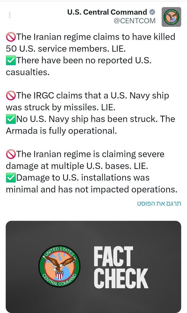Иранцы ночью и утром наносили удары по Израилю, Катару, Бахрейну, ОАЭ, сообщив о десятках пораженных объектов. В Центральном командовании ВС США весь урон свели к незначительным инфраструктурным повреждениям.