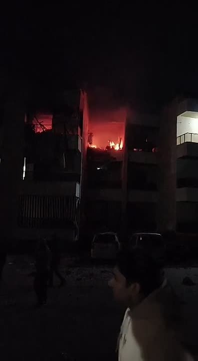 На кадрах — горящее разрушенное здание, рядом с которым бегают и кричат люди.