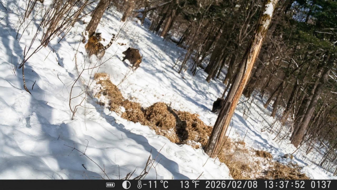 "При всей напряженности ситуации, сложившейся для копытных на фото, поражает невозмутимость второго кабана. Пока его товарищ пытается убежать от тигра, он практически не сдвинулся с места", — говорится в сообщении.