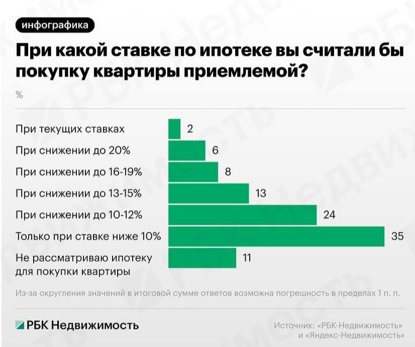 По данным совместного исследования «РБК Недвижимости» и «Яндекс Недвижимости», большинство россиян (59%) считают приемлемыми ставки по ипотеке от 12% годовых и ниже.При текущих ставках более 21% кредит готовы оформить лишь 2,3% опрошенных.За...