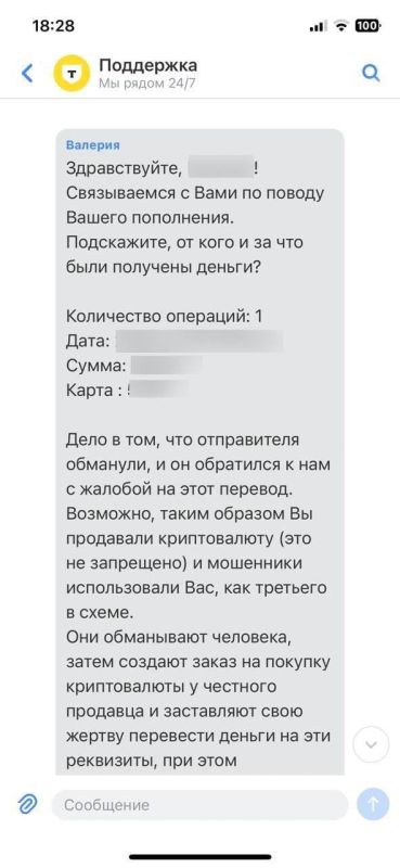 Юридическое агентство Cartesius опубликовало в телеграм-канале скриншот сообщения службы поддержки ТБанка клиенту, получившему перевод от жертвы мошенников в рамках P2P-сделки с криптовалютой.В обращении банк указывает, что...