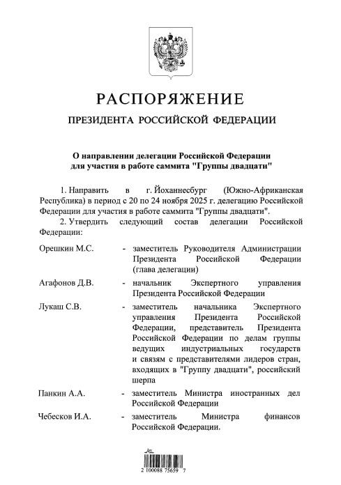 Замглавы администрации президента Максим Орешкин возглавит делегацию России на саммите G20, следует из распоряжения президента Владимира Путина. Саммит пройдет в Йоханнесбурге с 20 по 24 ноября.
