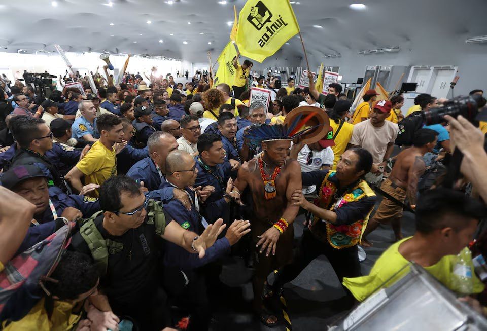 Как уточнил один из бразильских чиновников в разговоре с AP, протестующие были поделены на две группы — часть из них была одета в желтые рубашки, еще часть — в костюмы местных коренных народов. Изначально активисты просто пели и танцевали.