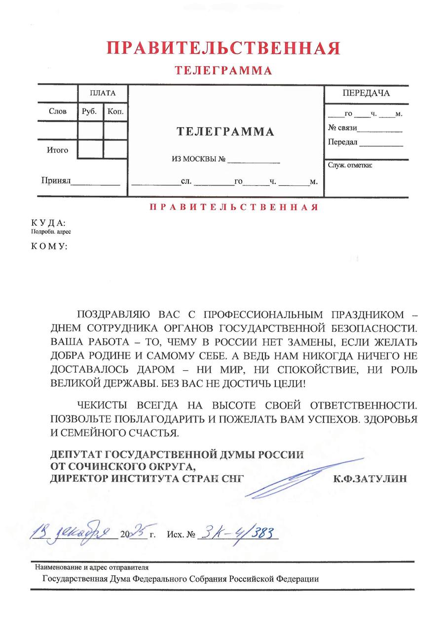 Константин Затулин 20 декабря поздравил с профессиональным праздником - днём Сотрудника органов государственной безопасности - Александра Бортникова, Николая Патрушева, Сергея Нарышкина, Дмитрия Кочнева, Владимира Кулишова и других руководителей, ветеранов и действующих сотрудников российских спецслужб: