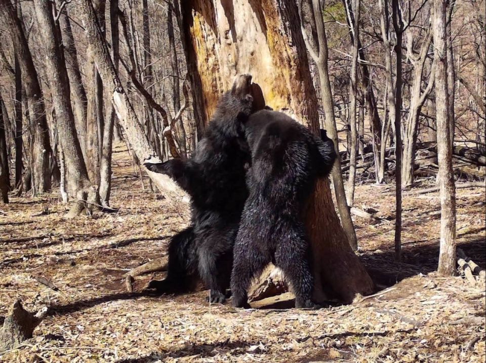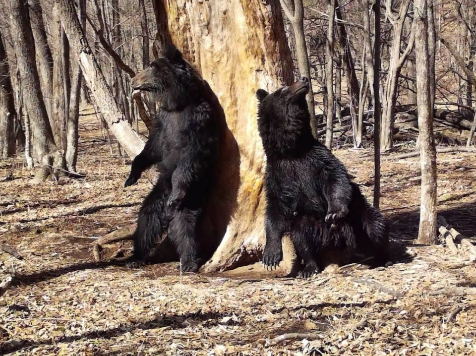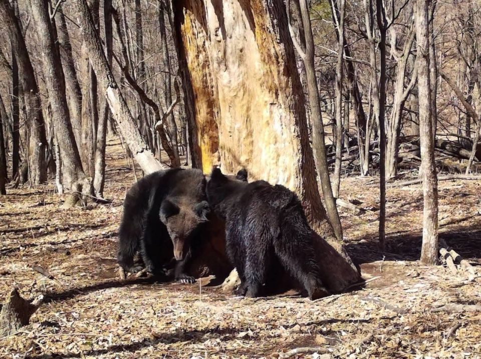 Фотоловушка национального парка запечатлела двух самцов бурых медведей, которые почти час осматривали и метили древнюю пихту, выросшую ещё во времена правления Екатерины II.