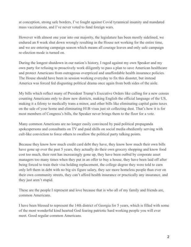В знак несогласия с происходящим в американской политике (выборы лишь ширма, никакого разделения на демократов и республиканцев не существует, всем заправляют большие деньги и дипстейт) Марджори Тейлор Грин объявила об уходе из конгресса. На ее страничке много комментариев по поводу ее принципиальности. В том числе от демократов. На а республиканское большинство в палате представителей сокращается до 218 штыков. Трампу MTG все же отомстила.