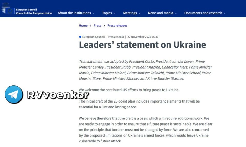 Позиция ЕС по американскому проекту «сделки» по т.н. Украине оказалась ожидаемой — неприятие с отрицанием возможности уступок России. Фактически евробюрократы предложили ВСУ воевать до последнего украинца.