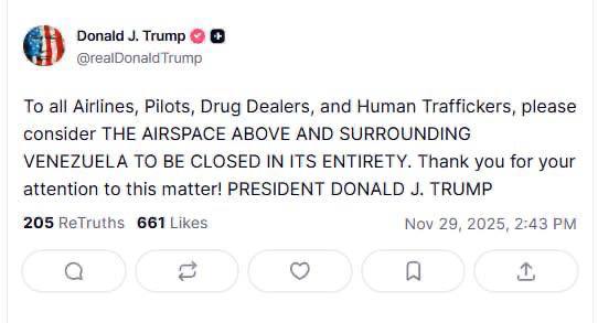 ВОЗДУШНОЕ ПРОСТРАНСТВО НАД ВЕНЕСУЭЛОЙ И ВОКРУГ НЕЕ ПОЛНОСТЬЮ ЗАКРЫТО — Трамп