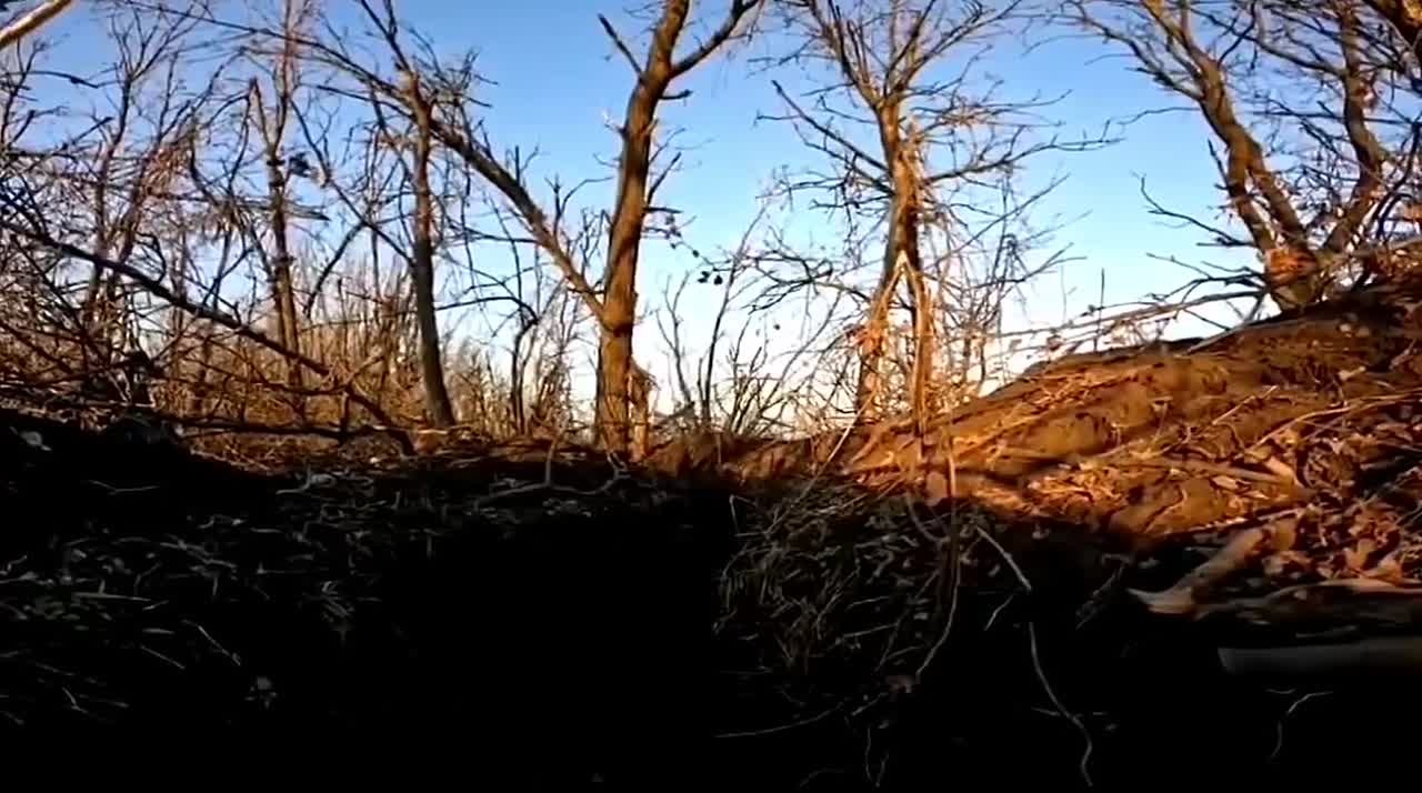Наши на закрепе в лесопосадке, принимают пленных. Снято вчера, судя по погоде.