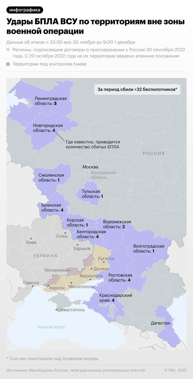 Атаки украинских дронов на российские регионы в ночь на 1 декабря — в инфографике.