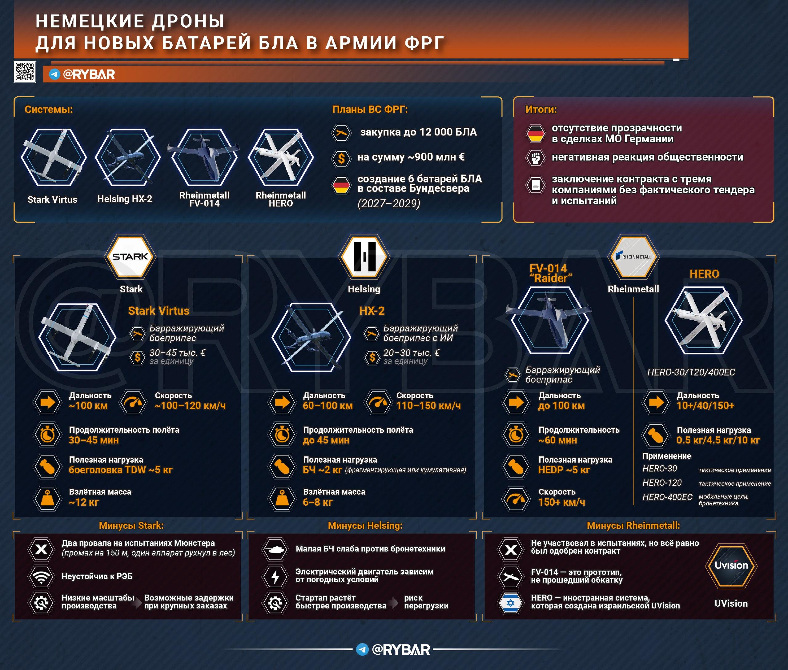 В конце октября в Мюнстере было проведено «секретное испытание» беспилотников от трех компаний – Helsing, Stark и Rheinmetall. По итогам минобороны ФРГ одобрило заказы на беспилотники на 900 млн у трёх этих компаний.
