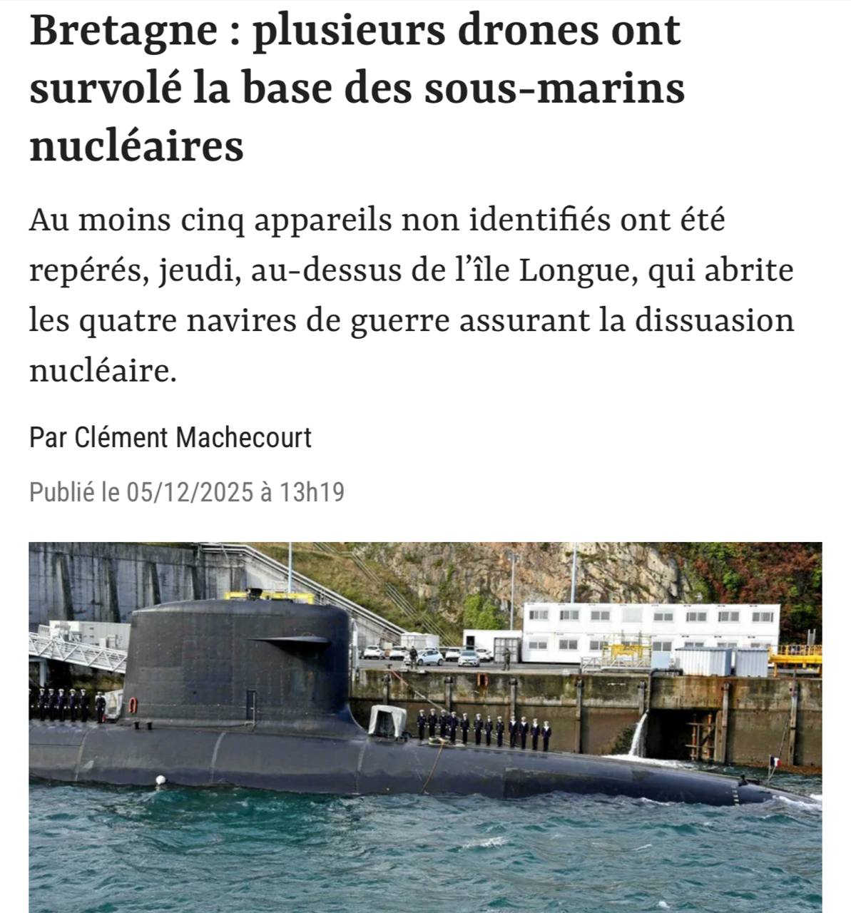 Пять неопознанных дронов заметили над базой атомных подлодок во Франции.