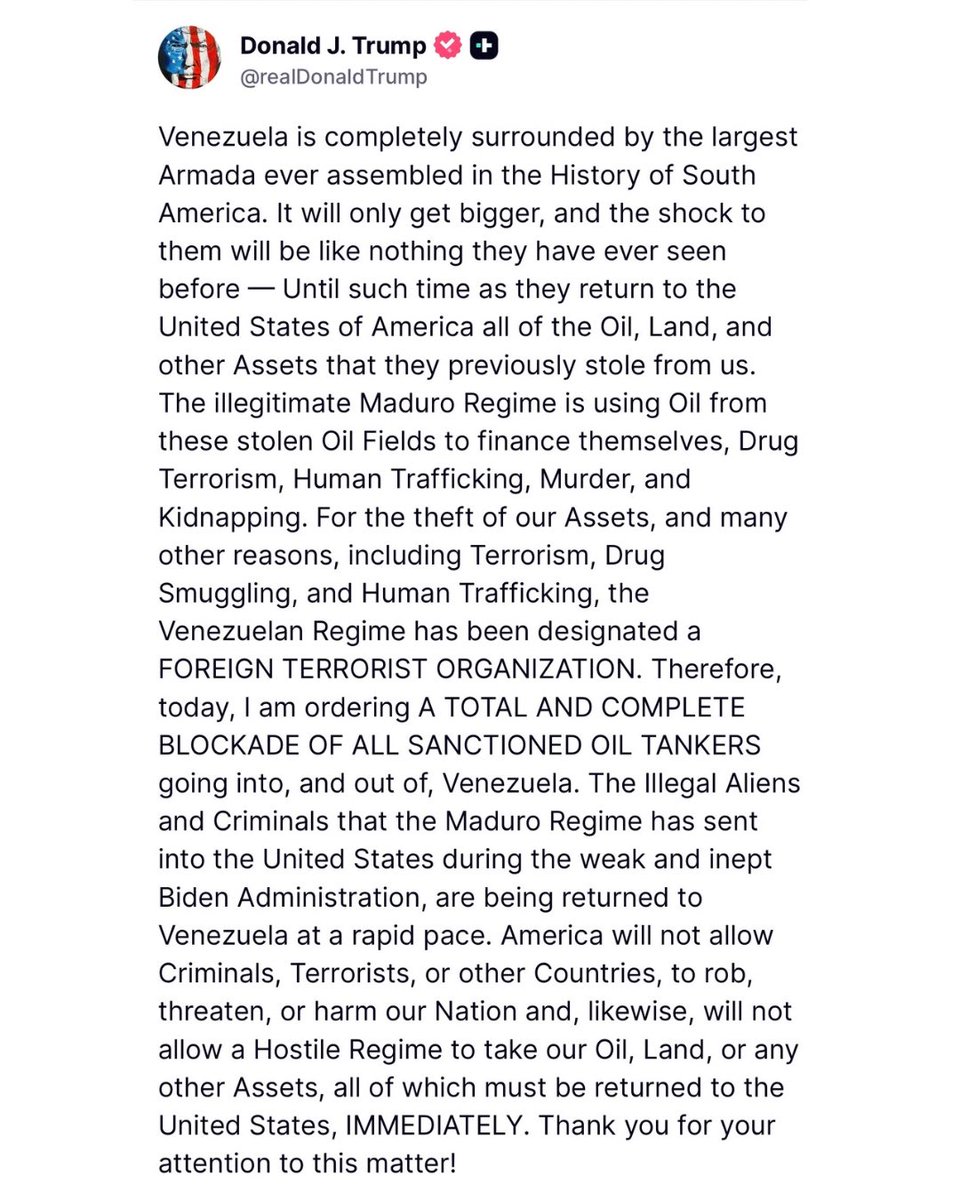 «Венесуэла полностью окружена самой большой армадой, когда-либо собранной в истории Южной Америки. Она будет только увеличиваться, и шок для них будет таким, какого они никогда прежде не видели – до тех пор, пока они не вернут Соединенным Штатам Америки всю нефть, землю и другие активы, которые они ранее украли у нас». Трамп заявил, что признал нынешние власти Венесуэлы иностранной террористической организацией и объявил о полной блокаде «всех подпавших под санкции нефтяных танкеров, следующих в Венесуэлу и из нее».
