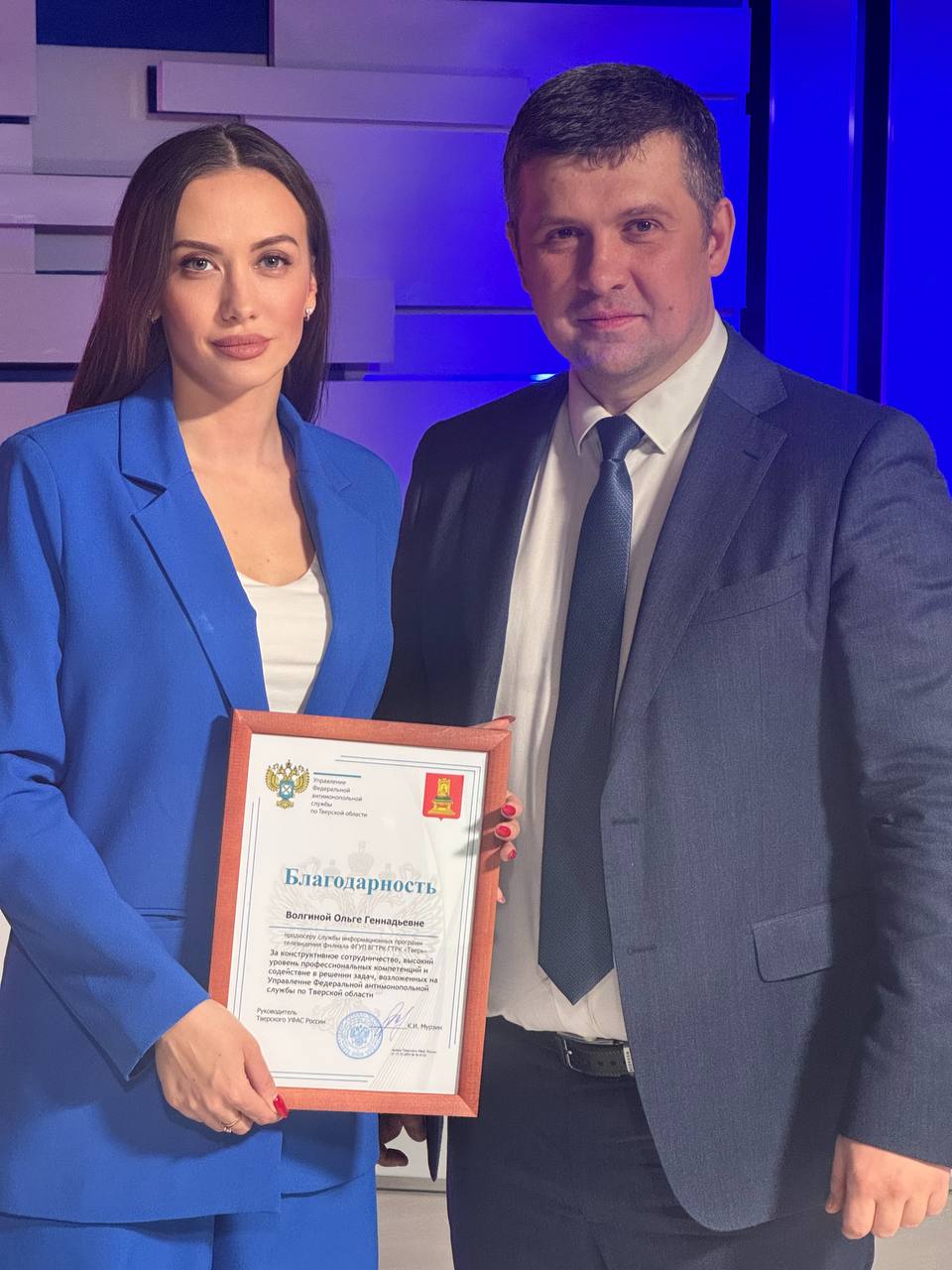 За сотрудничество и освещение деятельности Федеральной антимонопольной службы по Тверской области продюсер службы информационных программ ГТРК «Тверь» Ольга Волгина была награждена благодарственным письмом
