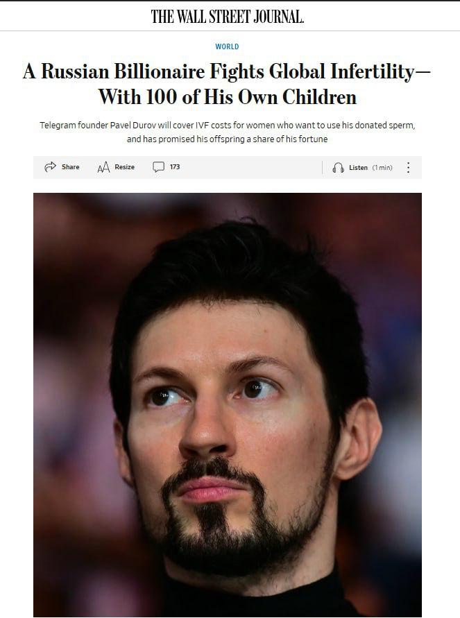 В заголовке Дурова называют «миллиардером, который борется с глобальным бесплодием». Отмечается, что он также готов предоставить права на наследство своим биологическим детям «когда-нибудь, может быть, через 30 лет».