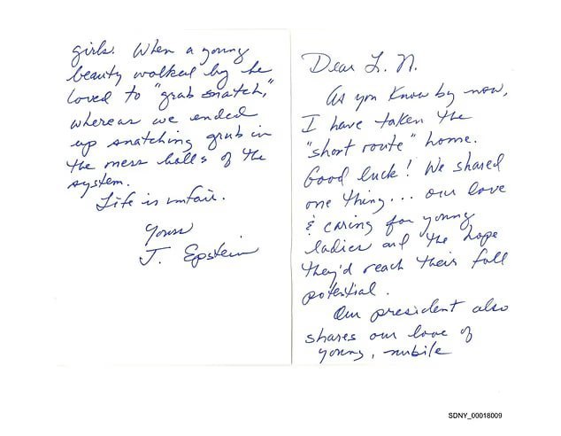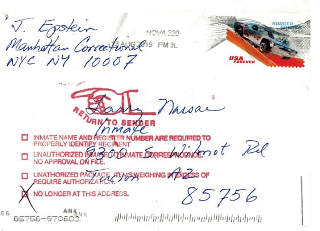 Минюст пояснил, что почерк не совпадает с почерком Эпштейна. Также письмо было принято почтой через три дня после его смерти из Северной Вирджинии. Эпштейн же покончил с собой в нью-йоркской тюрьме.