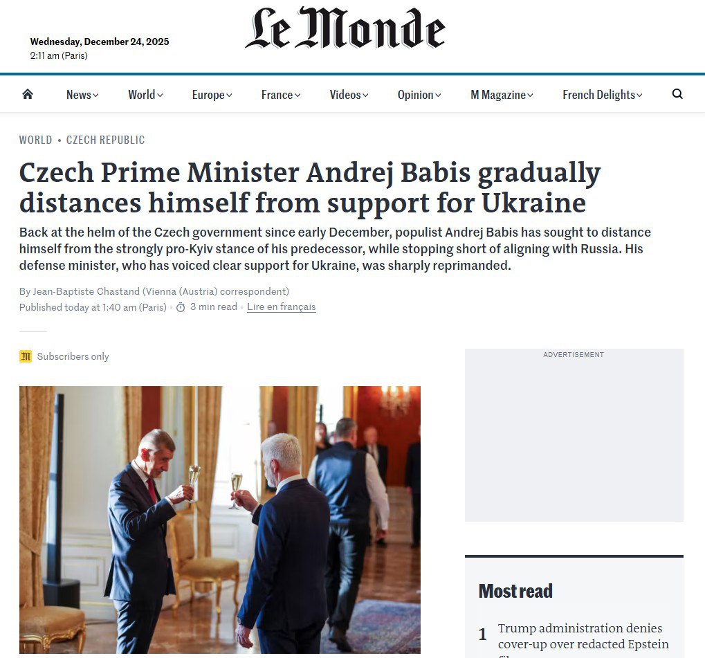 ‘Министр обороны Чехии получил строгий выговор за решение поддержать Украину’ – Le Monde о новой политике премьер-министра Бабиша.