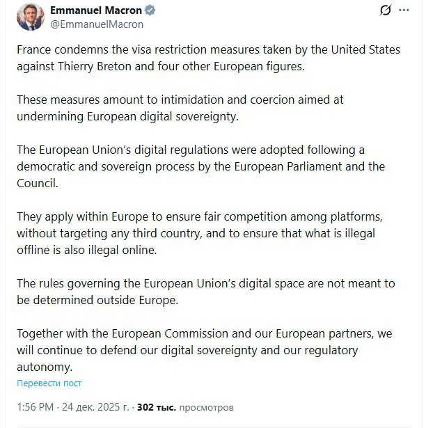 ‘Это запугивание и принуждение. Это подрывает европейский цифровой суверенитет’ – Макрону не понравилось, что США запретили выдачу виз европейцам, которые пытались управлять цензурой в ‘X’