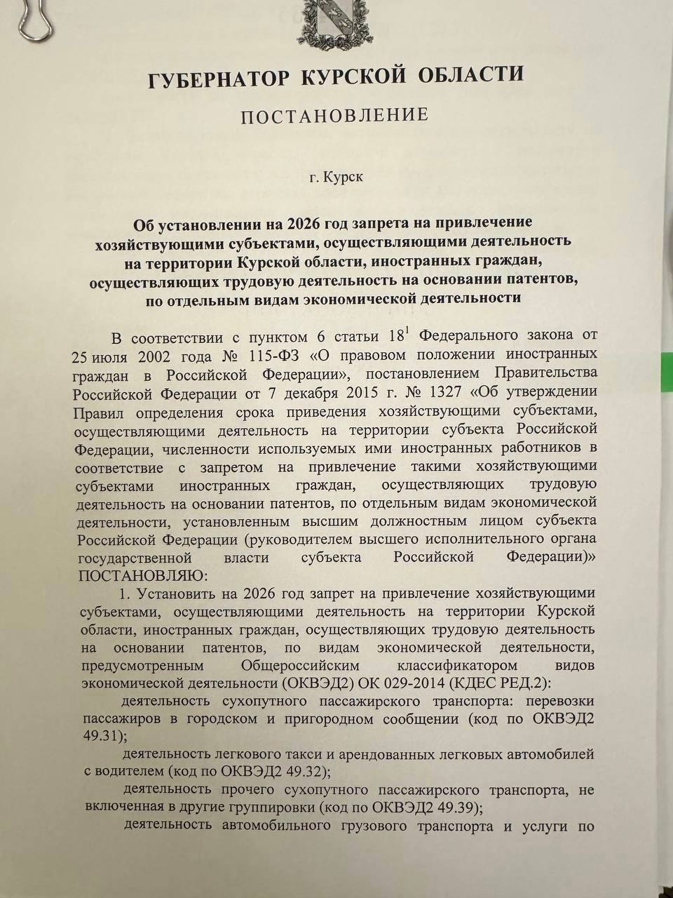Подписал постановление о запрете на работу мигрантов в отдельных сферах, связанных, в первую очередь, с людьми. Ограничения начнут действовать с 2026 года.