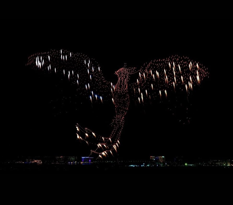 Празднование наступления 2026 года включало 15-минутное шоу дронов и фейерверков. Главным элементом стало анимированное изображение феникса — символа обновления и возрождения, созданное с помощью 2300 дронов. Тысяча пиродронов формировали огненный эффект крыльев.