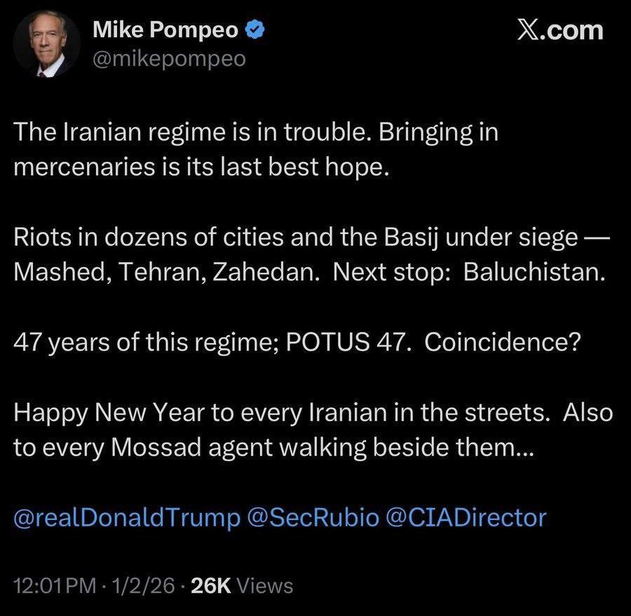 Бывший госсекретарь США Майк Помпео поздравляет с Новым годом «всех агентов «Моссада», которые разгуливают в эти дни рядом с иранцами на улицах во время протестов».