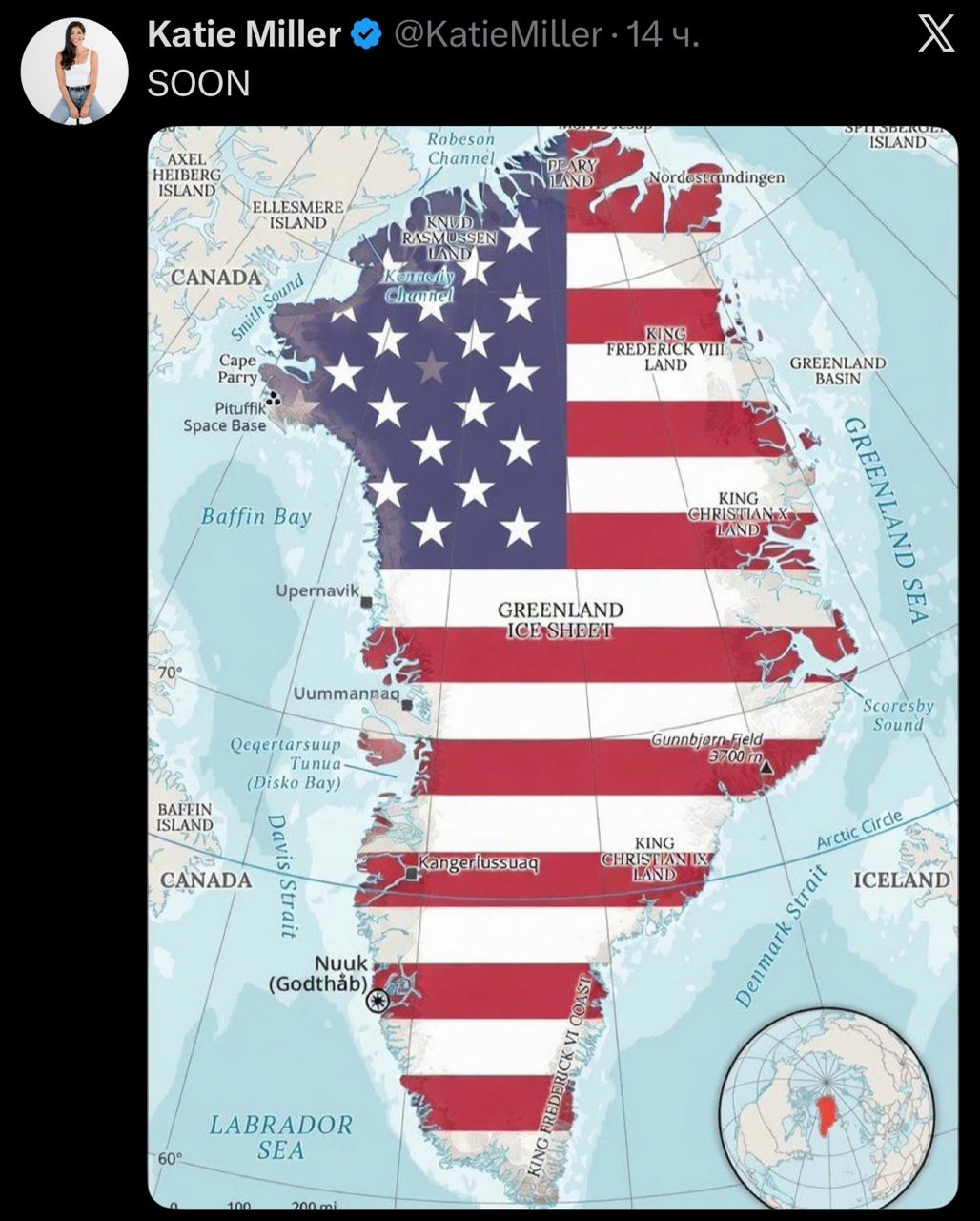 Жена заместителя главы аппарата Белого дома Стивена Миллера Кэти Миллер опубликовала изображение карты Гренландии, окрашенной в цвета американского флага. Картинку Миллер подписала словами: «Скоро». Такая публикация появилась на ее странице в социальной сети X.